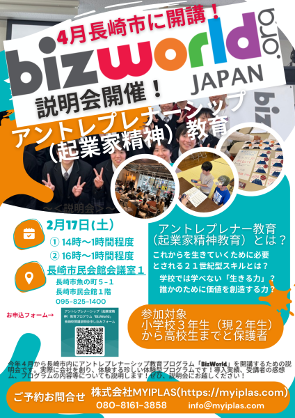 今年4月から、長崎市においてアントレプレナーシップ(起業家精神)教育「BizWorld」を開講いたします!それに伴い、説明会を開催いたします。